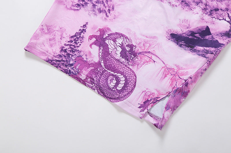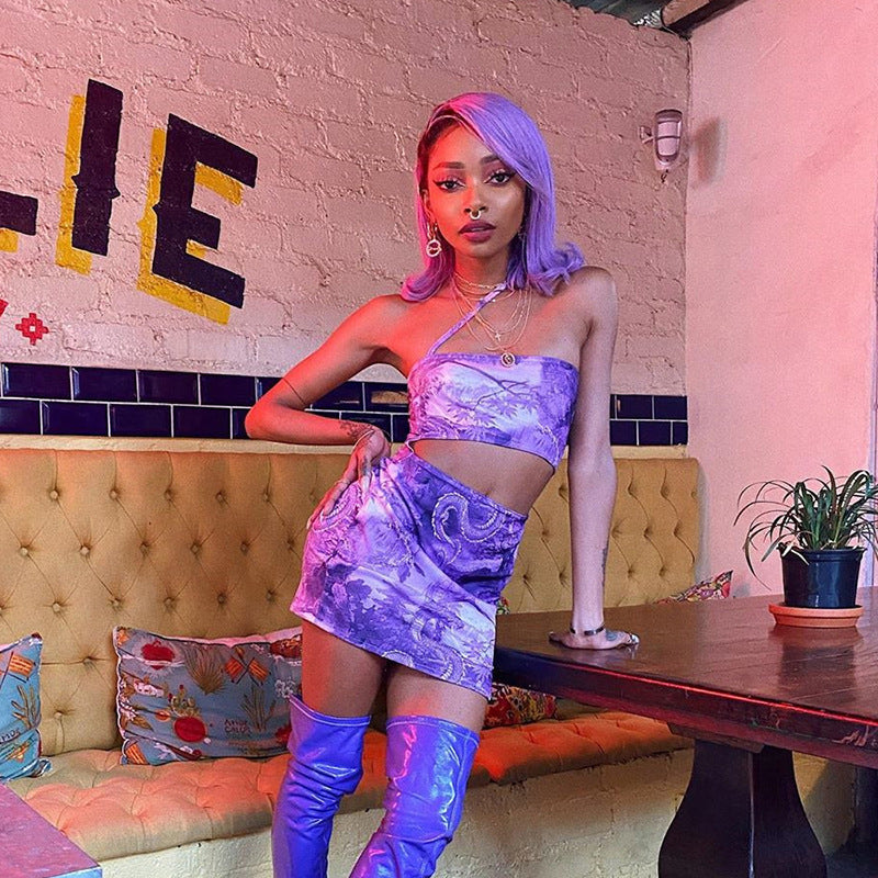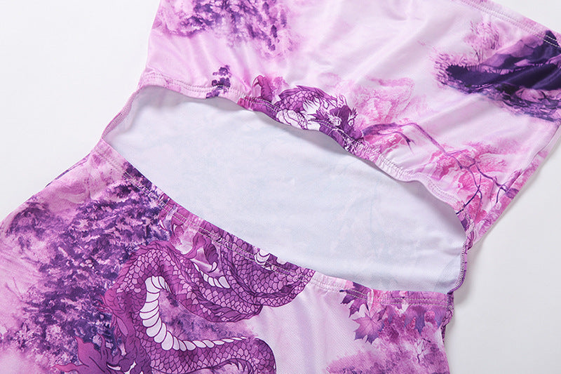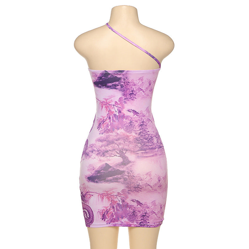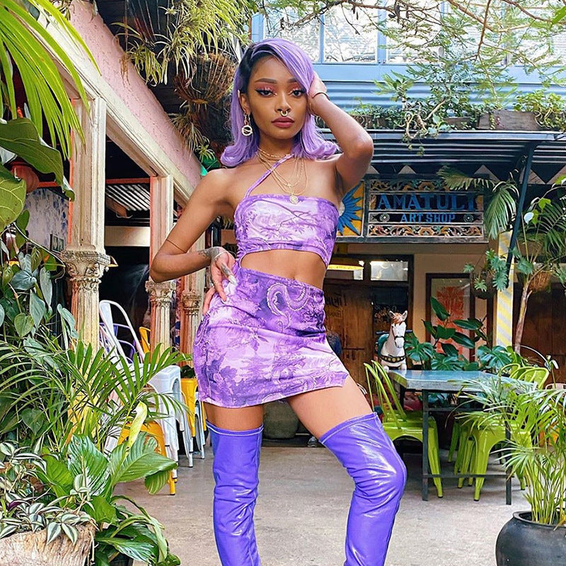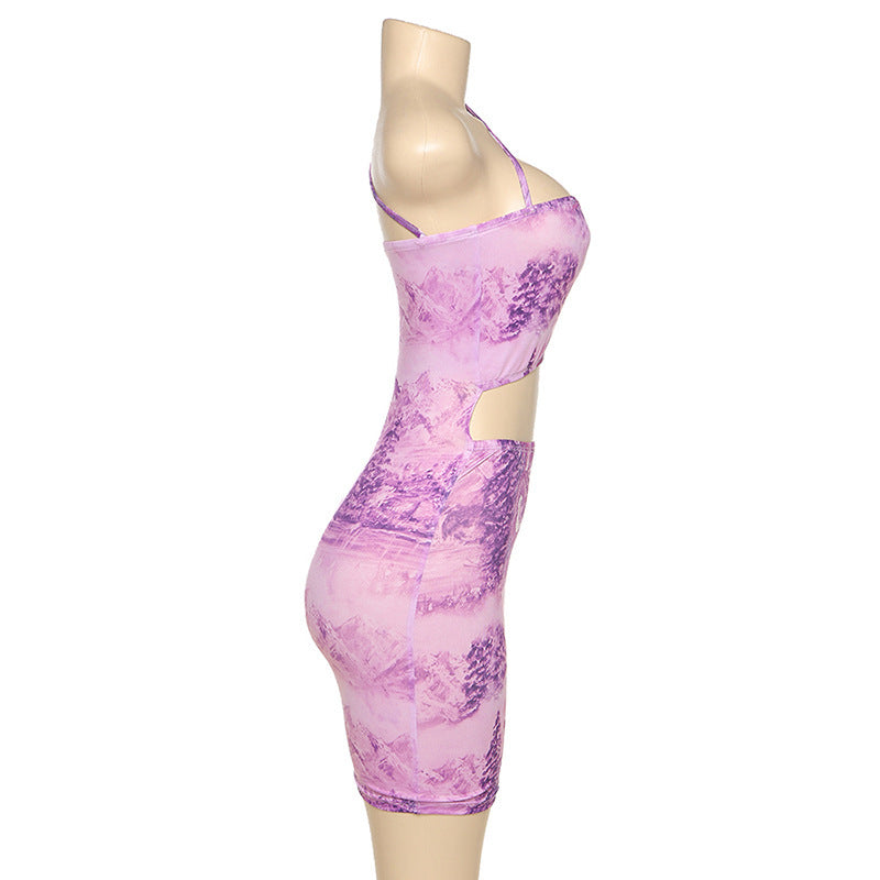 Hanging neck tube top sexy hollow print bag hip dress women